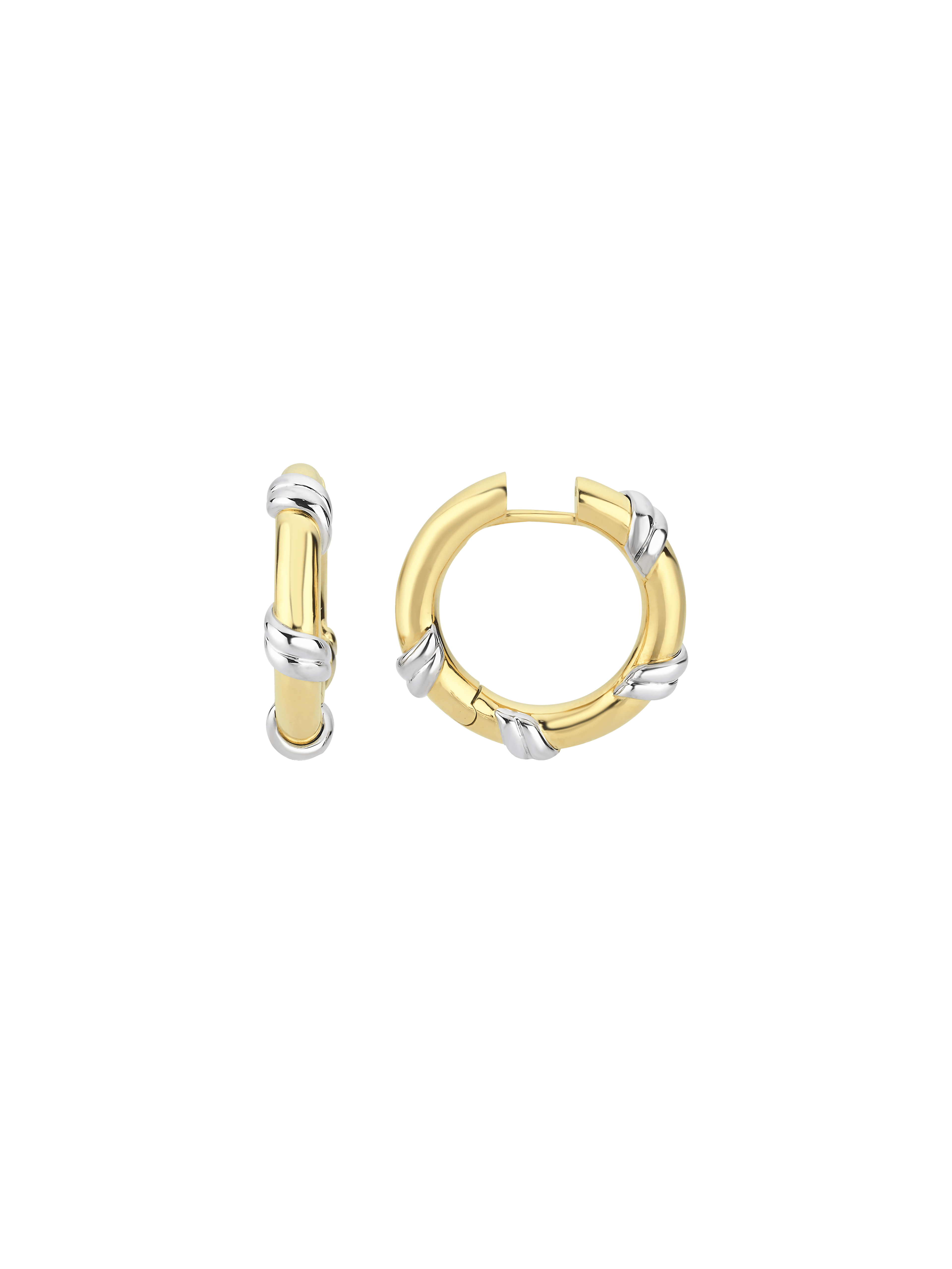 〝The medium Knoti Coil hoops are the perfect mixed metal hoops to dress up or down, combining white and yellow gold in the most modern way to wear our favorite precious metal.