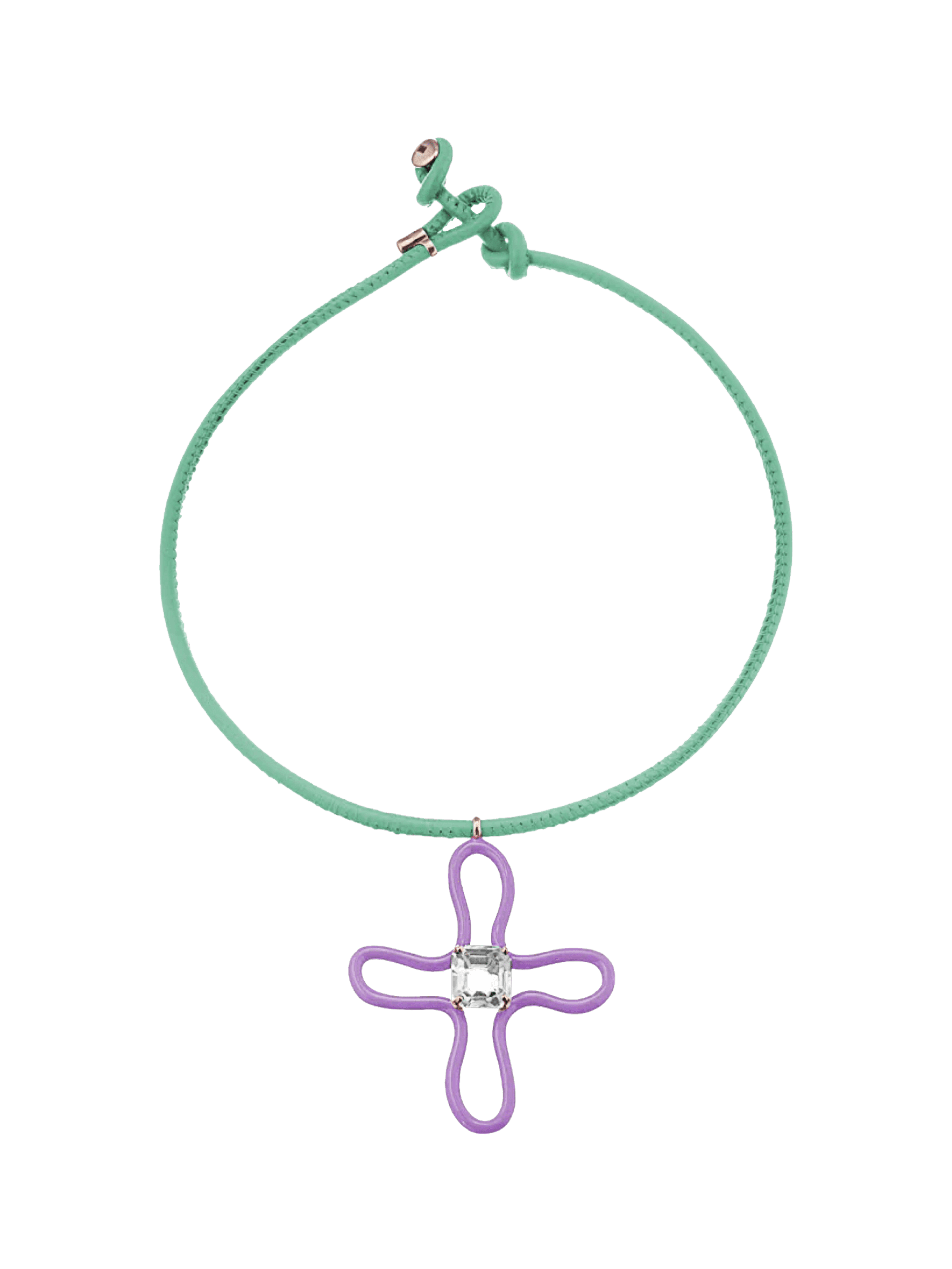 〝Channelling 90s nostalgia, Bea Bongiasca’s Pop Choker with Lucky Flower pendant pairs minty green leather cord with wisteria enamel and rock crystal. Ideal for elevating a minimalist outfit. 〞