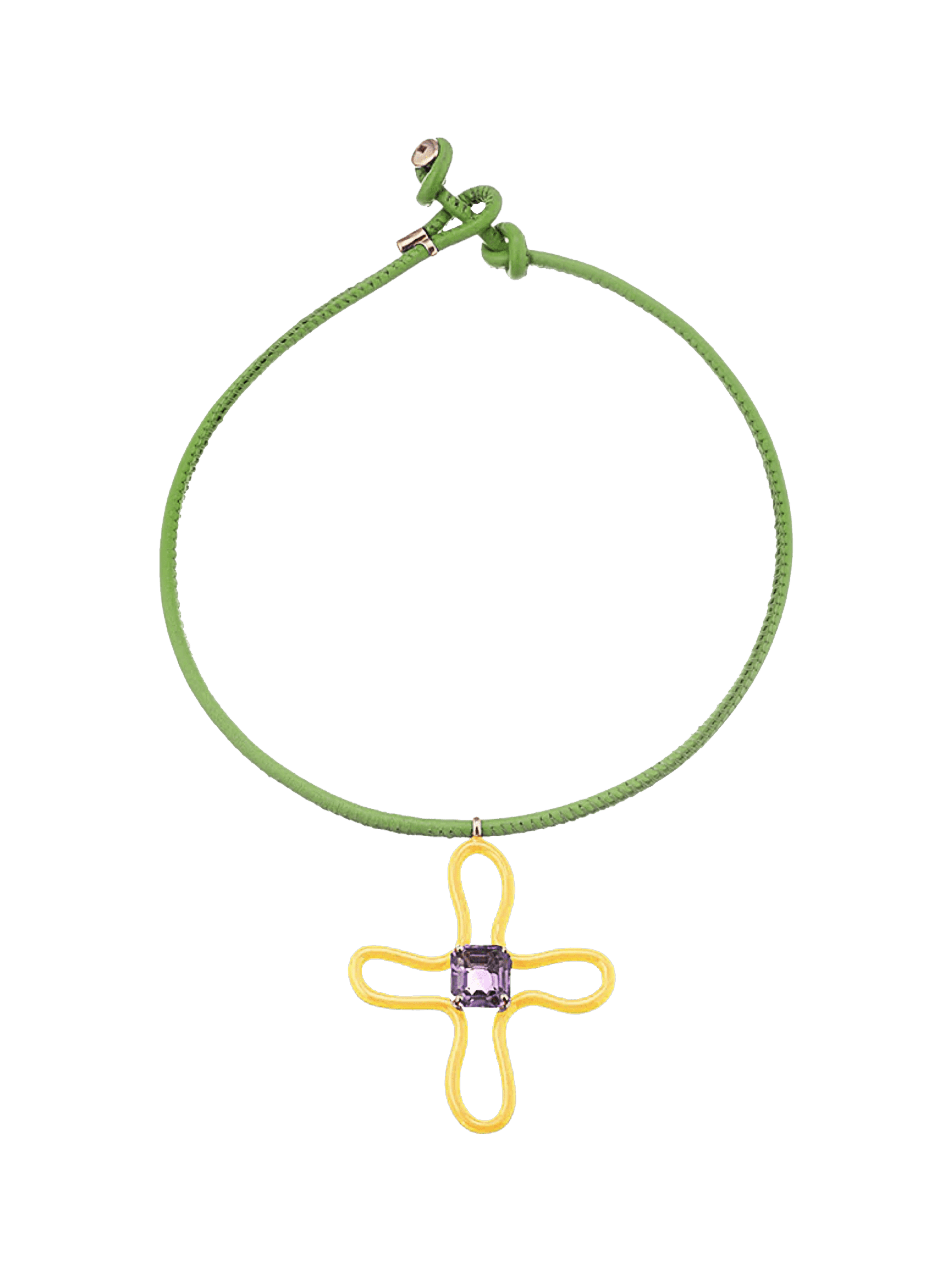 〝Channelling 90s nostalgia, Bea Bongiasca’s Pop Choker with Lucky Flower pendant pairs spring green leather cord with yellow enamel and amethyst. Ideal for elevating a minimalist outfit. 〞