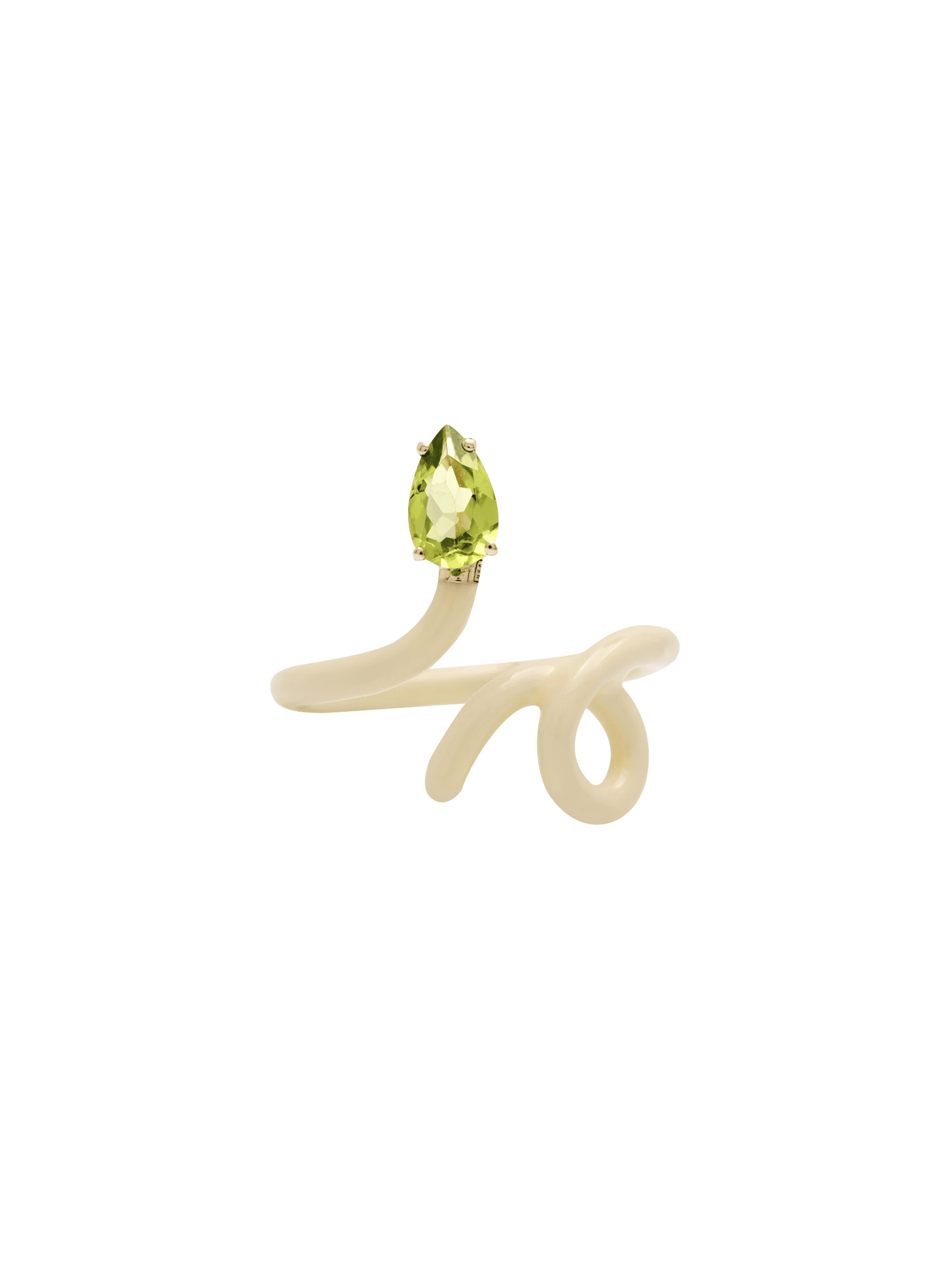 〝Bea Bongiasca’s distinctive look mixes brightly colored enamel with radiant gemstones, an uplifting combination that’s a super stylish shot in the arm, in jewelry form. Here, the Baby Vine Tendril Ring works panna and peridot.〞