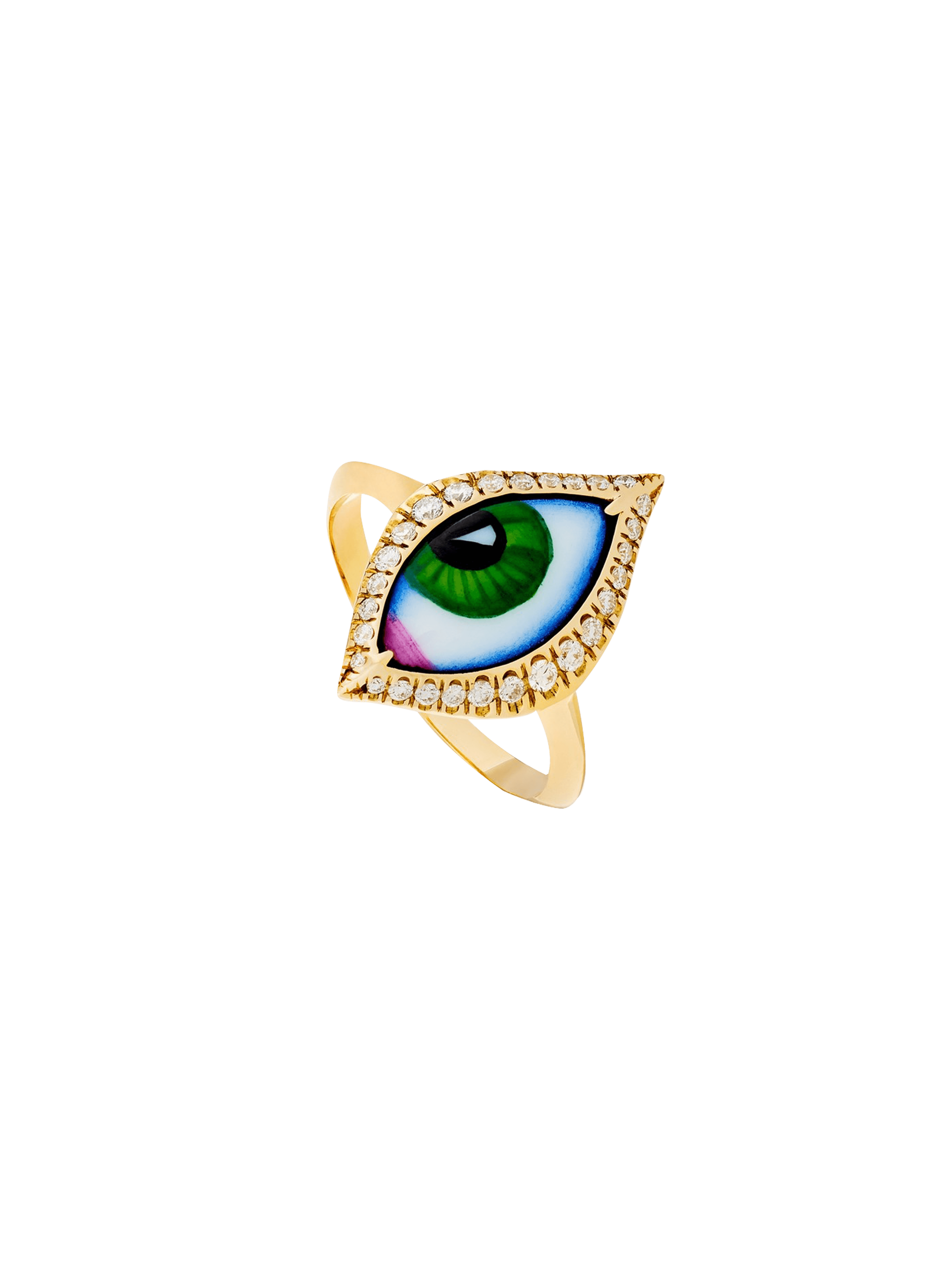 〝The hand-painted enamel Petit Vert eye ring has been emblematic of Lito’s jewelry since her Tu Es Partout collection launched, elevating a traditional Mediterranean amulet to precious adornment.〞