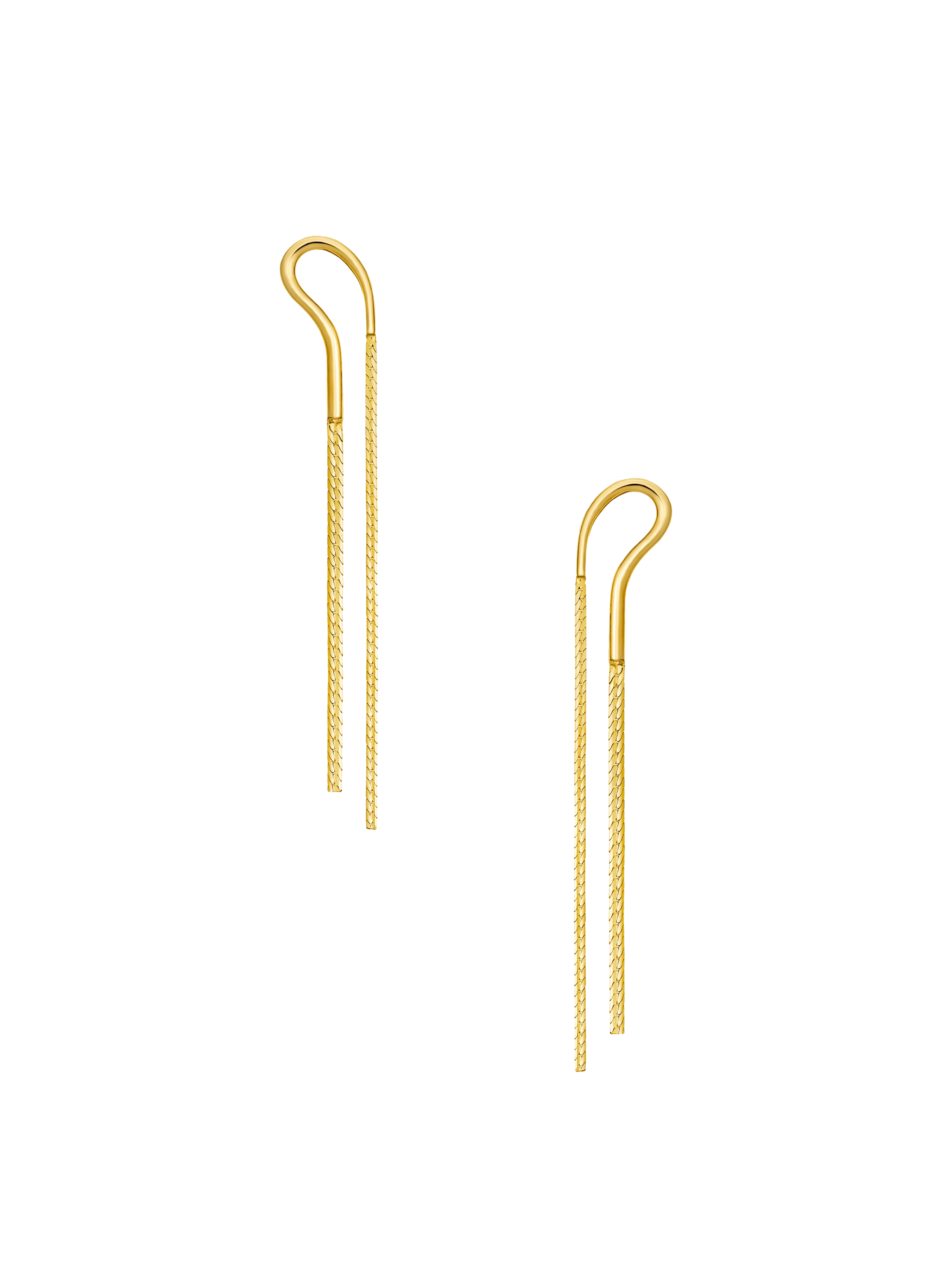 〝The last word in minimalism, Lito’s Night Tides gold earrings thread through the lobe for a dramatic ear look.〞