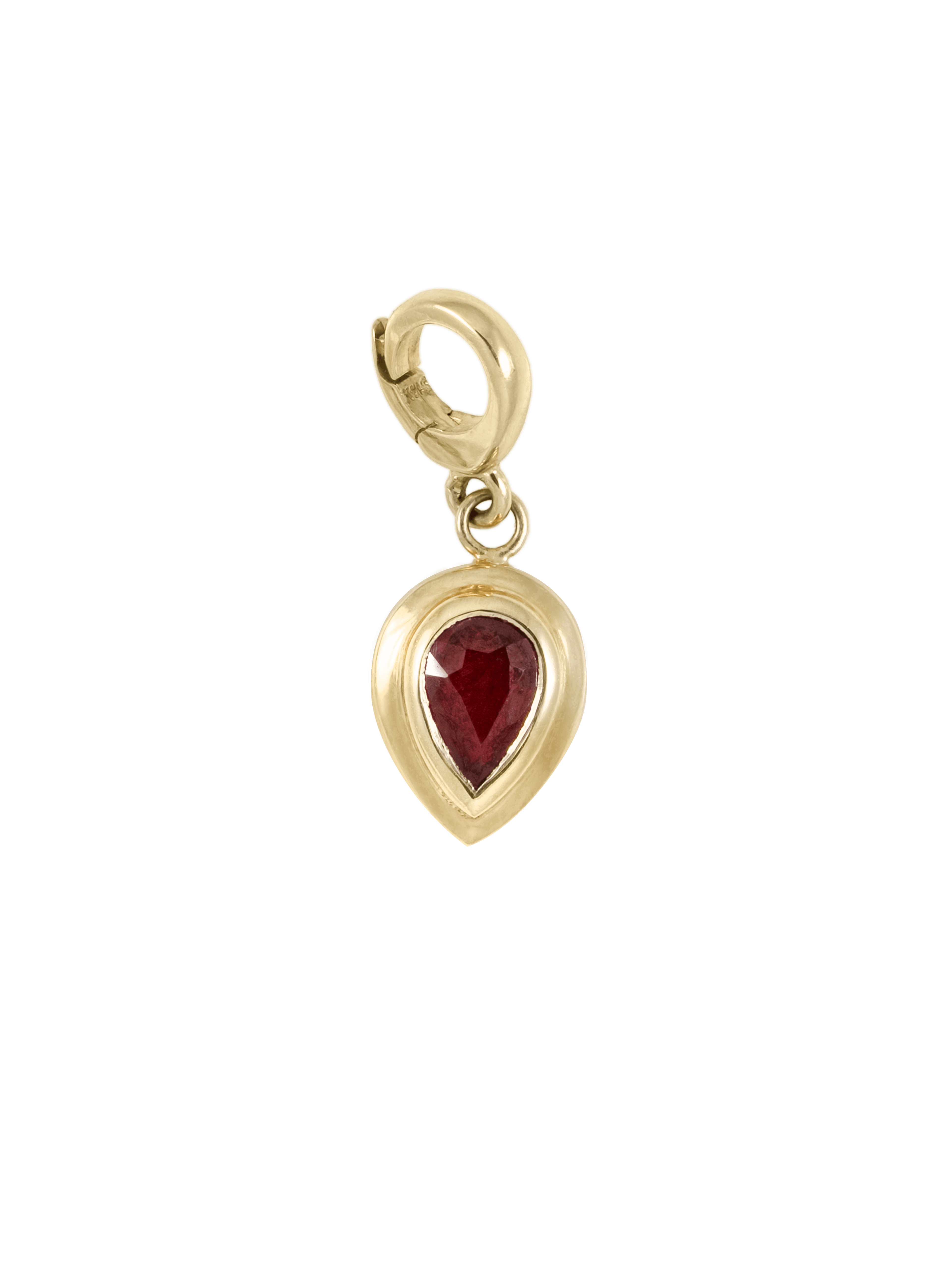 〝For July babies, or anyone looking for a stone of love and protection, this pear-cut ruby charm by Zoe Chicco is ready for your charm necklace.〞